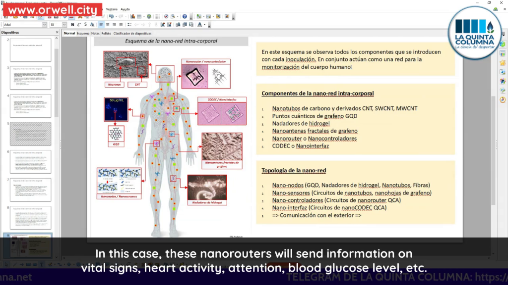 If you don’t know and you have been vaccinated, you should know that you have, inside your body, the artillery of nano-sensors, nano-technological nano-routers that, on the one hand, are going to collect all the biomedical electrophysiological markers of the person and, on the other hand, are provoking an artificial neuronal network that will replace the natural one. Hence, strange behaviors occur or, if you’re vaccinated, you might feel particularly strange. We’re talking, if you like, about technological parasitism. Of course, carried out with graphene oxide.